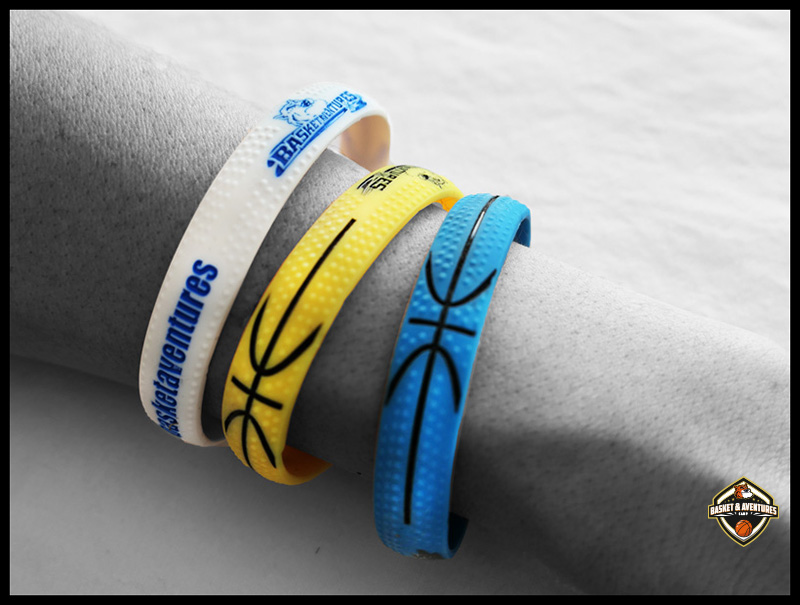 Le bracelet wristband Basket Aventures est en plastique souple avec un effet « crampon » de ballon de basket!