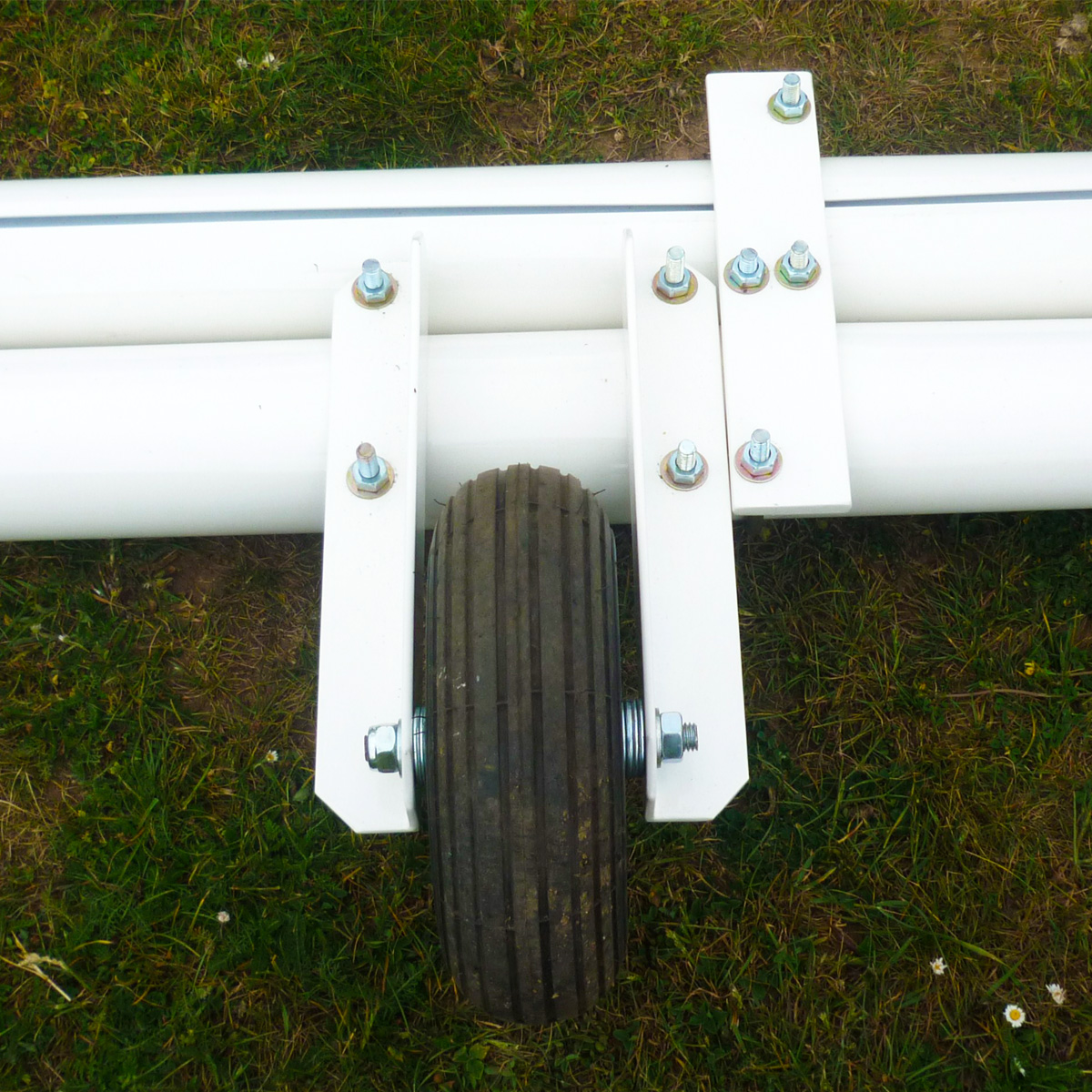 Plastifié blanc, avec oreilles support filet et jambes de force réalisées en tube acier galva Ø32mm. plastifié vert.