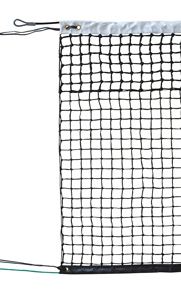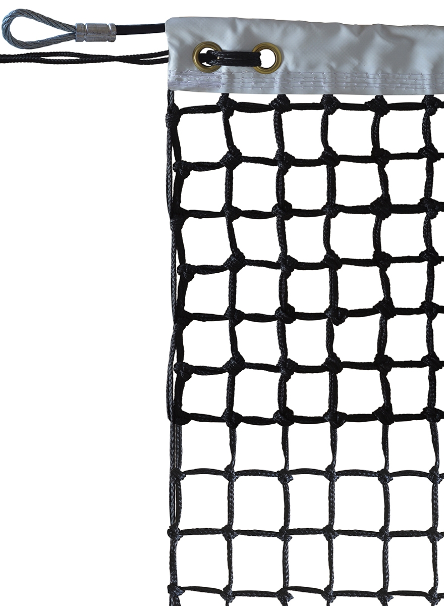 Filet de tennis, dimensions : 12,70 x 1,07 m. Tressé PE* avec noeuds. 7 rangées de MAILLE DOUBLE 40 mm. Ø du fil : 3mm. Coloris : Noir. PVC*110 mm blanc avec 4 surpiqûres. Câble acier gaîné Ø6mm en haut et cordeau en bas. Bande PVC noire 80 mm en bas. Modèle utilisé sur les courts de Roland Garros.