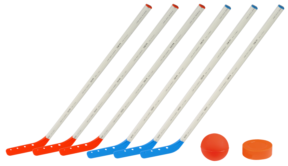 Ce kit comprend 6 crosses de hockey de longueur de manche 80 cm (3 rouges et 3 bleues),1 balle de hockey et 1 palet de hockey.
