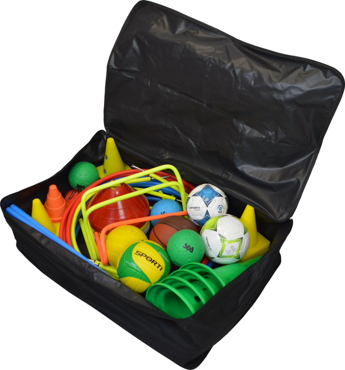 Grande capacité, il peut aisément accueillir tout type de matériel : cerceaux, jalons, mini-haies, ballons…