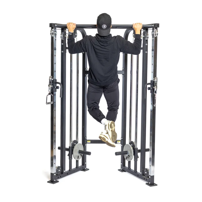 Combine la polyvalence du câble d’un entraîneur fonctionnel avec la fonctionnalité d’haltères d’un support de squat dans un encombrement réduit.